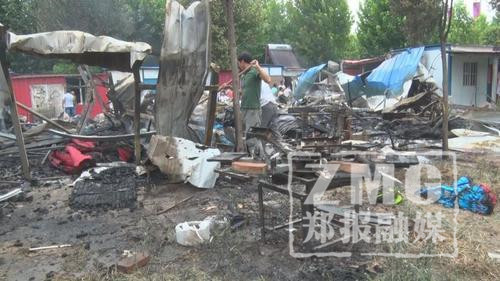 現場村民介紹,火災發生時附近有人正在做滿月酒,屋頂電線突然“噼啪”作響,火星濺下引燃了安置區的簡易房,失火房屋內放置有生產包的設備和成捆的布匹。