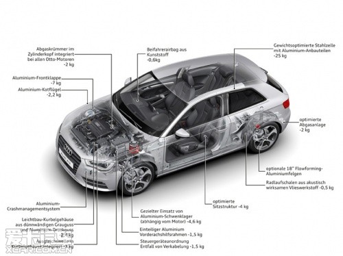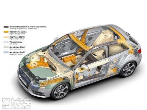 “輕量化”之于奧迪,已然成為品牌精髓所在,截止2011年已有70萬輛裝備了AFS輕質(zhì)車架的奧迪汽車駛下生產(chǎn)線。全新一代奧迪A3相比老款的減重達(dá)到了80千克,首當(dāng)其沖的就是采用了復(fù)合材料車架,車架型材包括了奧迪擁有自主知識產(chǎn)權(quán)的:超硬鋼、先進高強度鋼、高強度鋼、低碳鋼以及鋁板。這些不同材料通過多種連接方式構(gòu)成了強度大幅提升的車身,同時重量下降了18千克。而大眾集團最新的“MQB”橫置發(fā)動機模塊化平臺則能夠幫助奧迪A3進一步減輕重量,比如A3使用的前輪鋁制副車架就帶來了6千克的減重效果。